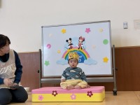 みんな泣かずにステージの上に立つことが出来ました!!好きな食べ物やあそびを発表しました。誕生児のお友だちに歌を歌ってみんなでお祝いしました!職員の出し物では3匹の子ブタのパネルシアターをみました。